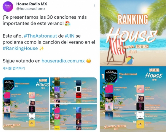 멕시코에서 독보적인 인기를 이어가고 있는 진의 '디 애스트로넛'은 'Rankig House TOP30' 차트에서 지난 5월 20일(현지 기준) 주간에 첫 차트인을 시작으로, 6월 3일 주간에 첫 1위로 등극했다. 최근 11월 25일(현지 시각) 주간 1위에 오르며 총 16번째 1위를 차지하며 독보적인 대기록을 이어가고 있다.