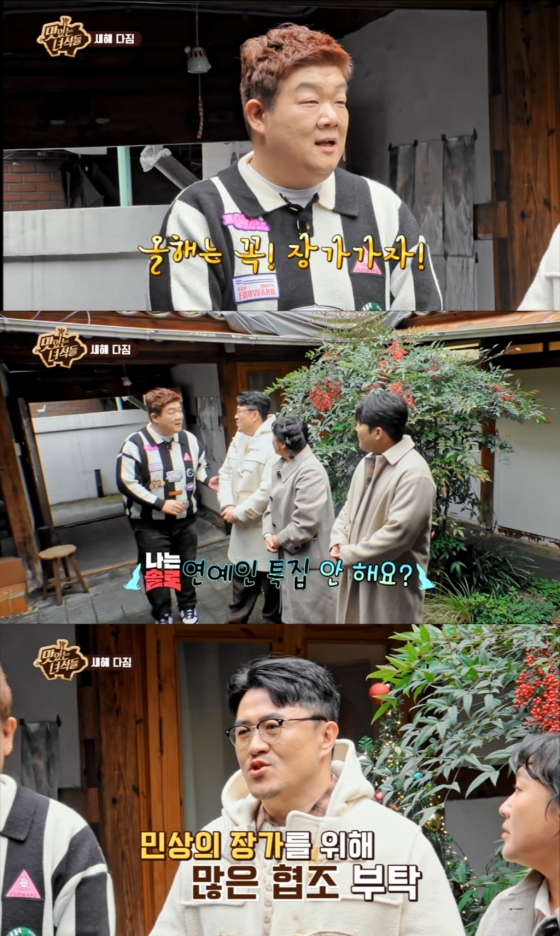 유민상도 "참 재미있구나. 열심히 하는구나라며 긍정적인 마음으로 멤버들을 대하겠다"고 밝힌다. 또 "올해는 꼭 장가가자. 연애 사업을 발전하자"며 개인적인 목표도 공개한다. 이어 "'나는 솔로' 연예인 특집 안하냐? 사람들이 나한테 영철로 나가라고 한다"며 연애에 대한 진심도 전해 웃음을 안긴다.