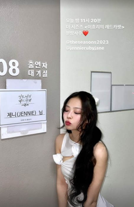 제니는 '더 시즌즈-이효리의 레드카펫' 대기실에 자신의 이름이 걸린 것을 행복해하며 입술을 내민 모습이다. 제니는 해당 게시물을 자신의 계정에 리그램하며 이날 녹화에 남다른 애정을 보였다.