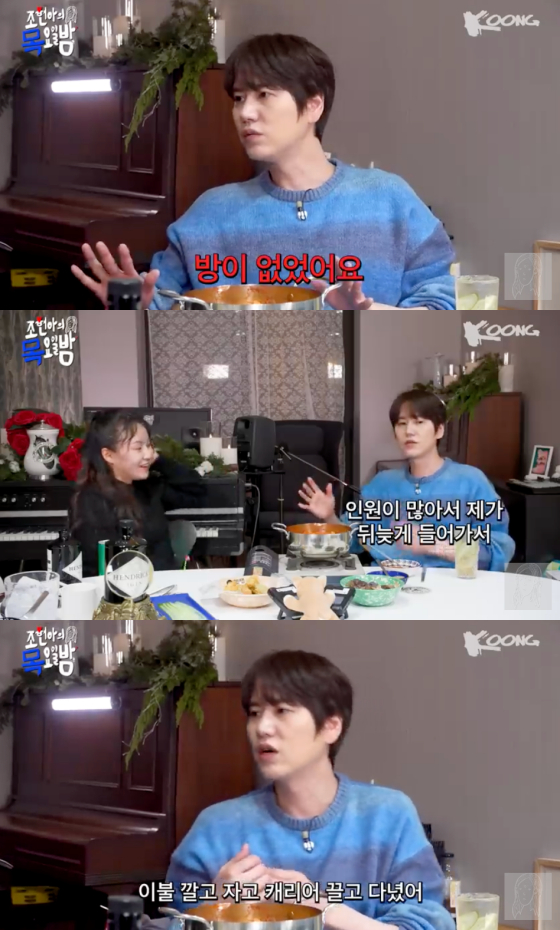 이어 "처음에는 방이 없었다. 누구 침대 옆에서 그냥 이불 깔고 자고 캐리어 끌고 다녔다"며 다른 멤버들보다 6개월 늦게 입소해 자리가 없었다고 털어놨다. 규현은 "그래서 거실에서도 자고, 여러 방 왔다 갔다 썼다"며 "그런 아픔이 있어 숙소에 애착이 있던 것 같다"고 밝혔다.