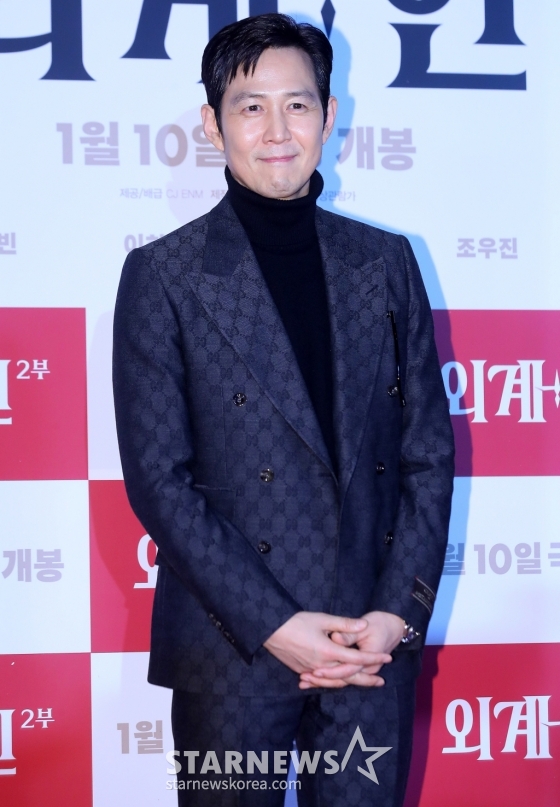 배우 이정재가 5일 오후 서울 용산구 아이파크몰 CGV에서 진행된 영화 '외계+인 2부' VIP시사회에 참석해 포즈를 취하고 있다.