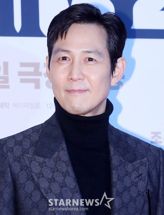 배우 이정재가 5일 오후 서울 용산구 아이파크몰 CGV에서 진행된 영화 '외계+인 2부' VIP시사회에 참석해 포즈를 취하고 있다.