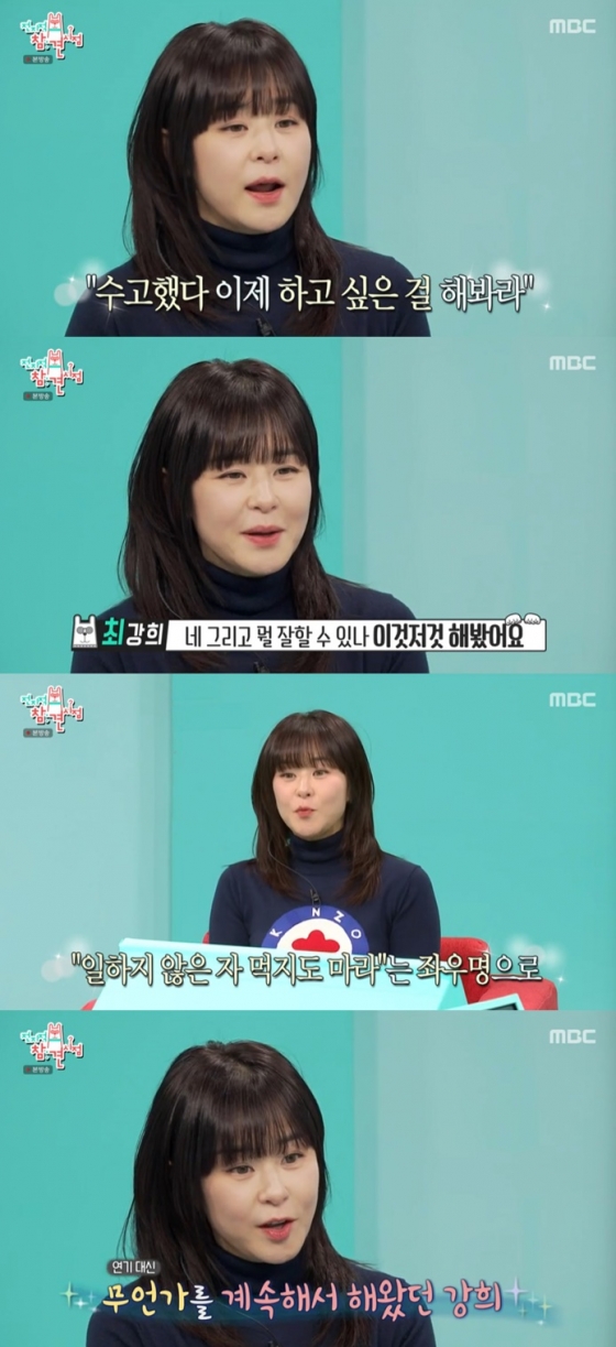 전현무가 "번아웃 같은 거냐"라고 하자 최강희는 "행복하지 않았다. 제가 25년 동안 일했더라. 그리고 내가 뭘 잘할 수 있나 이것저것 해봤다. 저는 '일하지 않는 자 먹지도 말라'라는 좌우명이 있어서 이것저것 해봤다"라고 말했다.