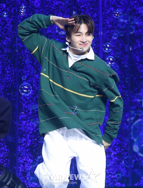 신인그룹 TWS(투어스) 지훈이 22일 오후 서울 용산구 블루스퀘어에서 진행된 미니 1집 'Sparkling Blue' 발매 기념 쇼케이스에 참석해 멋진 무대를 선보이고 있다.