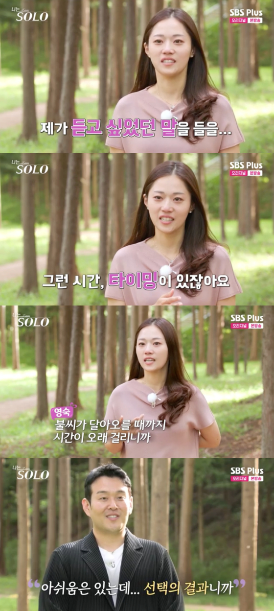 송해나는 "영수 씨가 한 대 맞은 거다 그냥"이라며 일갈했다. 3 MC는 모든 출연자의 선택을 존중한다는 말로 방송을 마쳤다. 길어진 고민으로 타이밍을 놓친 영수와 영숙 커플의 모습이 시청자들에게 아쉬움을 남겼다.