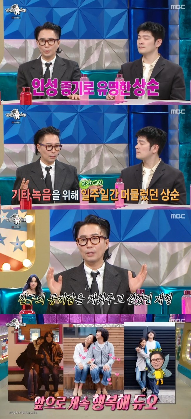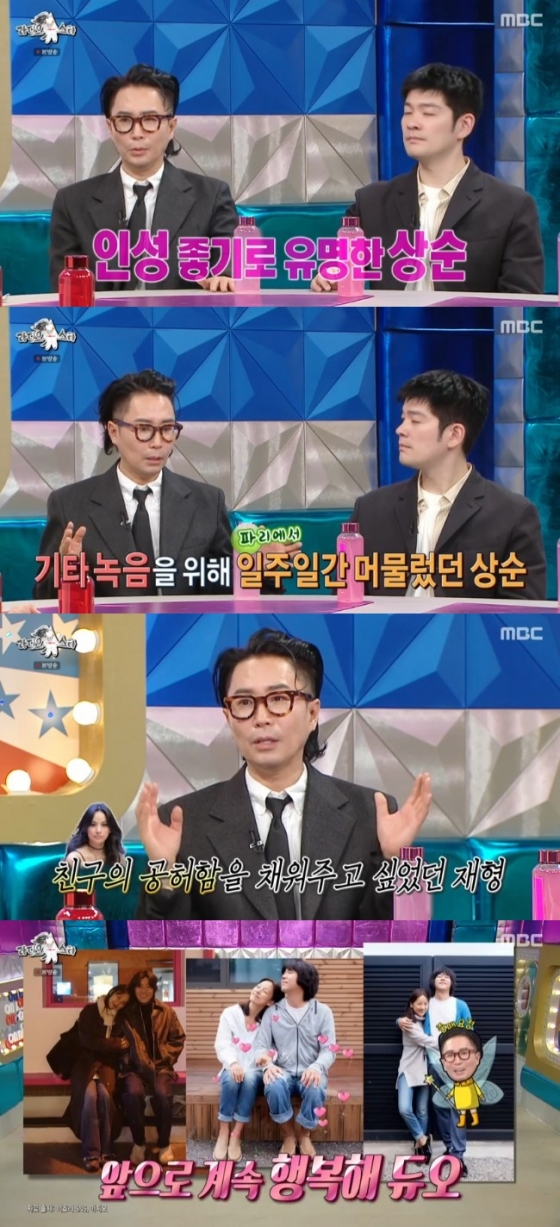 이날 방송에서 정재형은 이효리 이상순 부부의 오작교 역할을 했다며 중매요정을 꿰찬 비하인드를 밝혔다. 그는 "상순이가 인성이 되게 좋은 친구다. 제 앨범을 녹음하러 파리에 있는 동안 상순이가 기타 녹음으로 일주일간 머물러있었다. 함께 있는 동안 진짜 많은 얘길 했다"고 운을 뗐다.
