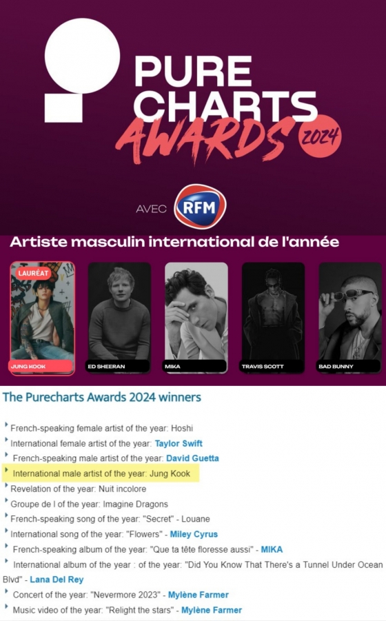 퓨어 차트는 "성공적인 솔로 활동을 펼치고 있는 방탄소년단 정국이 프랑스 및 해외 팬들의 대대적인 참여로 올해의 국제 남성 아티스트상을 수상했다"고 밝혔다.