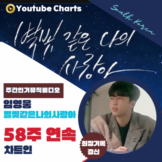 가수 임영웅의 '별빛 같은 나의 사랑아' 뮤직비디오가 유튜브 주간 인기 뮤직비디오에서 최장 기간 차트인 기록을 경신했다.