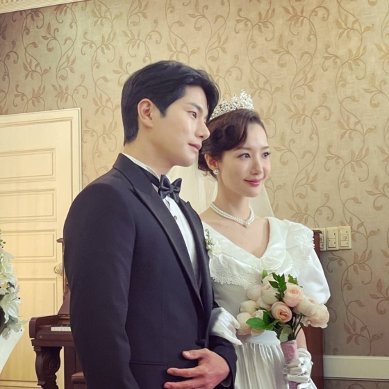 사진 속 이이경은 박민영과 팔짱을 낀 채로 다정한 분위기를 자아내고 있는 모습. 두 사람은 턱시도와 순백의 웨딩드레스를 완벽 소화, tvN '내 남편과 결혼해줘' 시청자들에게 반가움을 안겼다.