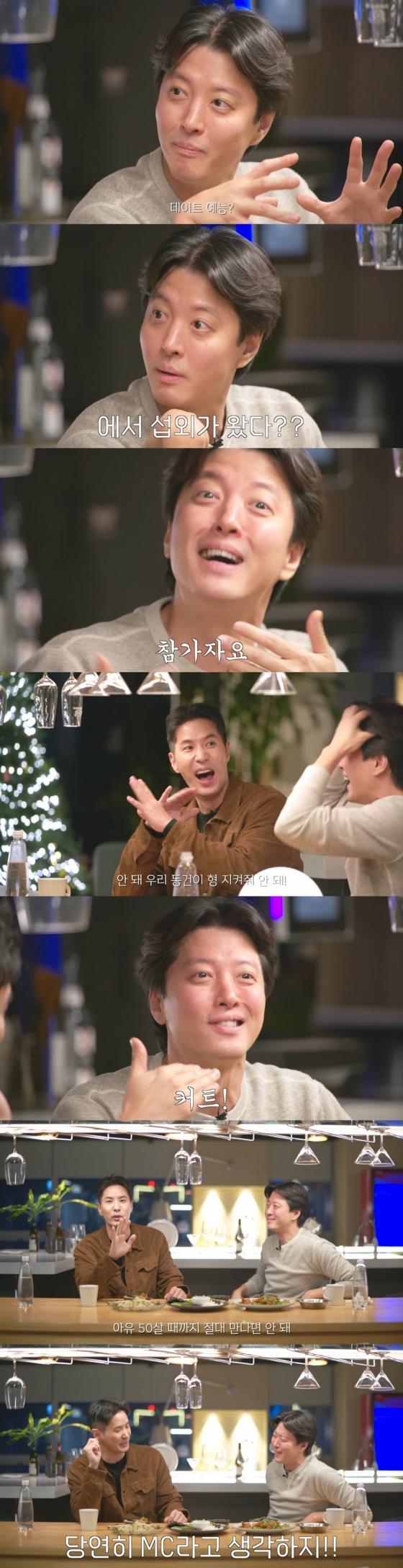 이날 이동건은 "어젠가 데이트 예능에서 섭외가 왔다"라고 말해 김지석을 깜짝 놀라게 만들었다. 이어 이동건은 "매니저에게 'MC요?' 라고 물었더니 '아니요, 참가자요'라고 하더라"라고 밝혔다.