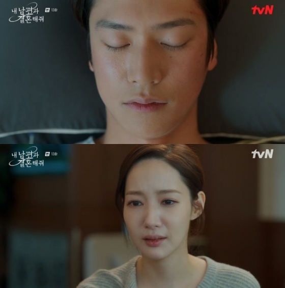12일 방송된 tvN 월화드라마 '내 남편과 결혼해줘' 13회에서는 혼수상태인 유지혁(나인우 분)을 바라보며 눈물을 흘리는 강지원(박민영 분)의 모습이 담겼다.