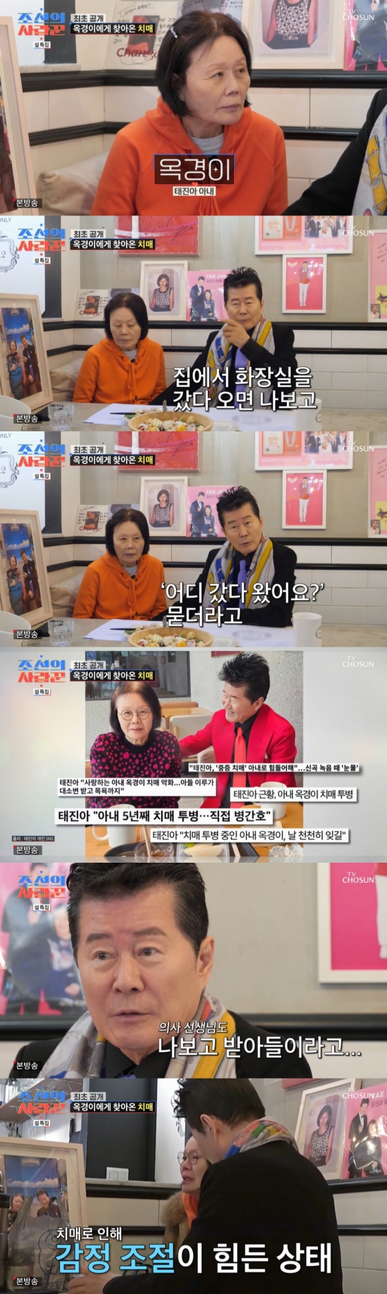 이에 태진아는 "나는 옥경이 옆을 벗어나지 못한다. 다른 환자하고 달라서 치매 환자는 본인이 꽂힌 그 사람만 생각한다"라고 이야기했다.