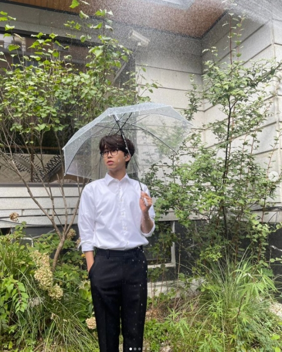 사진에서 임영웅은 흰 셔츠에 검은 정장바지를 입고 비오는 날에 우산을 쓴 모습을 보였다.