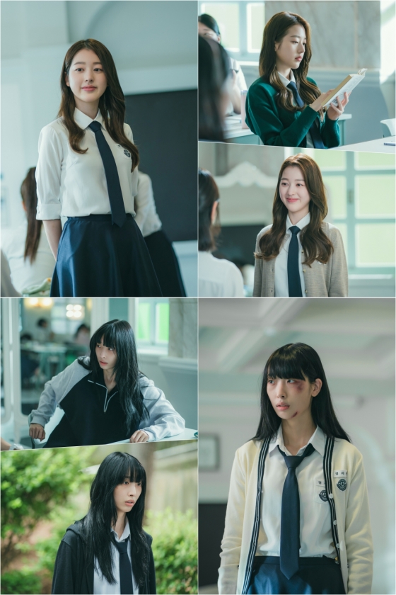 13일 티빙 오리지널 시리즈 '피라미드 게임'(극본 최수이, 연출 박소연, 크리에이터 이재규, 제작 필름몬스터·CJ ENM 스튜디오스, 제공 티빙)이 백연여고 2학년 5반 서열 피라미드의 양극단에 있는 백하린(장다아 분)과 명자은(류다인 분)의 첫 스틸을 공개했다.