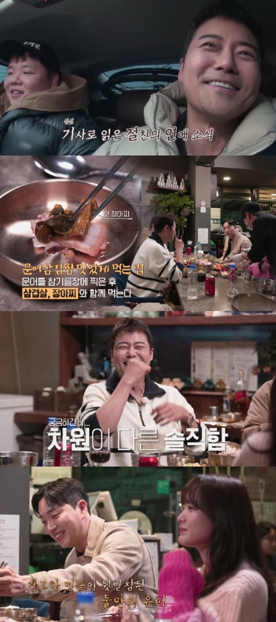 근황 토크 후, 네 사람은 전현무가 추천한 성수동의 한 맛집에 도착했다. 호텔 출신 부부 셰프가 운영하는 이 곳은 문어삼겹살찜과 갑오징어 요리가 유명한 곳. 각종 요리가 푸짐하게 상을 채우자, 모두는 갓 장아찌를 곁들인 이색 삼합을 먹으며 감격했다. 그러던 중 전현무는 "지은이가 워낙 '홀리'해서(성스러워서) 남자를 잘못 만나면 안 될 것 같아서 고민했었는데, 기사로 (박위와의 열애를) 봤을 때 마음이 놓였다"고 말했다.
