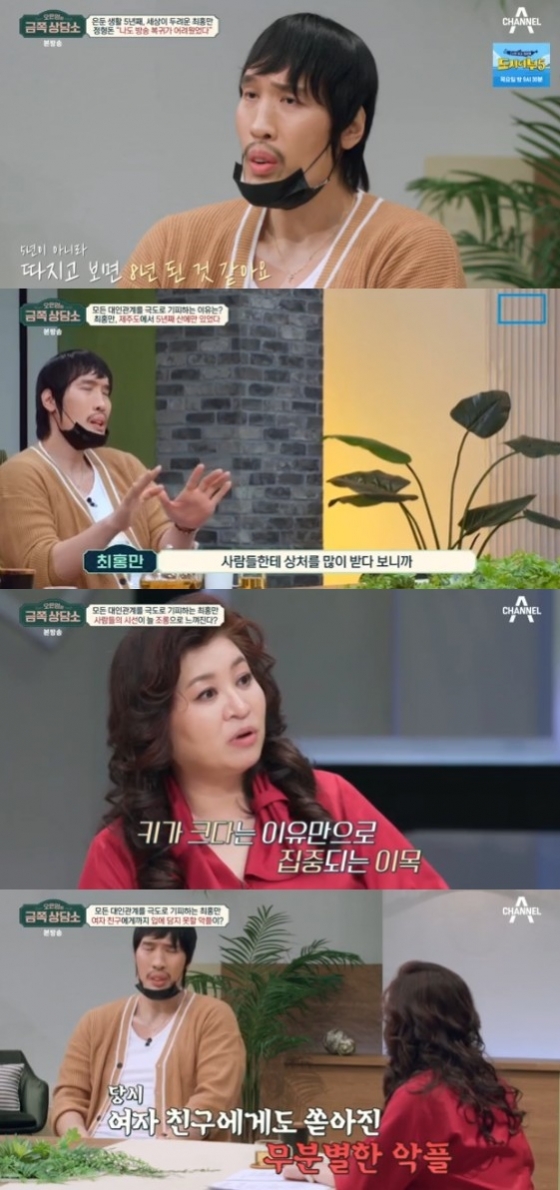 20일 방송된 채널A 예능 프로그램 '오은영의 금쪽 상담소'에서는 최홍만이 출연해 고민을 털어놓았다.