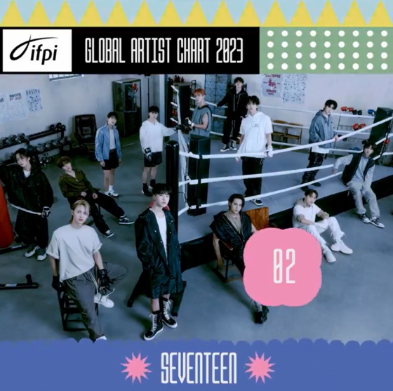IFPI가 21일(현지시간) 공식 홈페이지에 발표한 '2023년 글로벌 아티스트 차트(Global Artist Chart 2023)'에 따르면, 세븐틴(에스쿱스 정한 조슈아 준 호시 원우 우지 디에잇 민규 도겸 승관 버논 디노)은 테일러 스위프트에 이어 2위를 차지했다. 이는 이번 차트에서 K팝 아티스트 중 최고 순위이며 3년 연속 톱10이다.