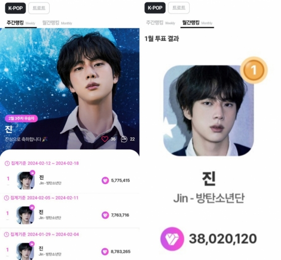 진은 지난 1월에도 마이원픽 'K-POP부문' 총 하트 수 3802만 120표를 얻어 '1월 월간랭킹' 1위에 올라 독보적인 존재감을 입증했다.