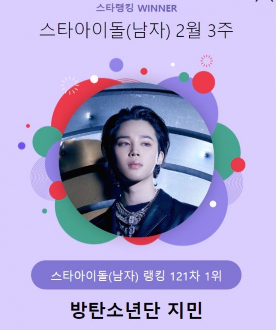 지민은 지난 15일 오후 3시 1분부터 22일 오후 3시까지 진행된 2월 3주(121차) 스타랭킹 스타아이돌 남자 랭킹 투표에서 3만5048표를 얻어 1위를 차지했다.