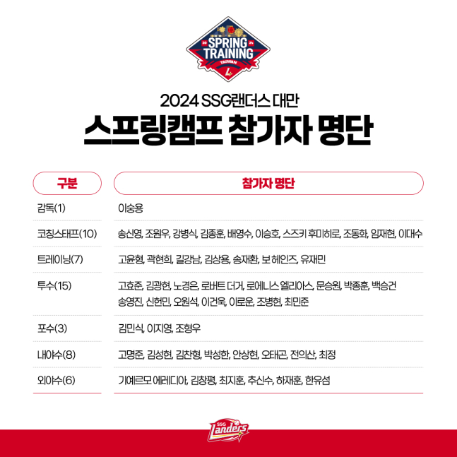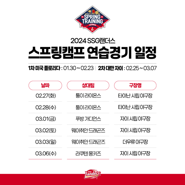SSG는 지난달 31일부터 미국 플로리다 베로비치에서 진행된 1차 스프링캠프를 마치고 23일 오후 5시 45분 인천국제공항에 도착한다. 하루 휴식을 취한 선수단은 25일 오전 9시 45분 대만 자이로 출국, 3월 7일 오후 4시 35분 귀국한다.