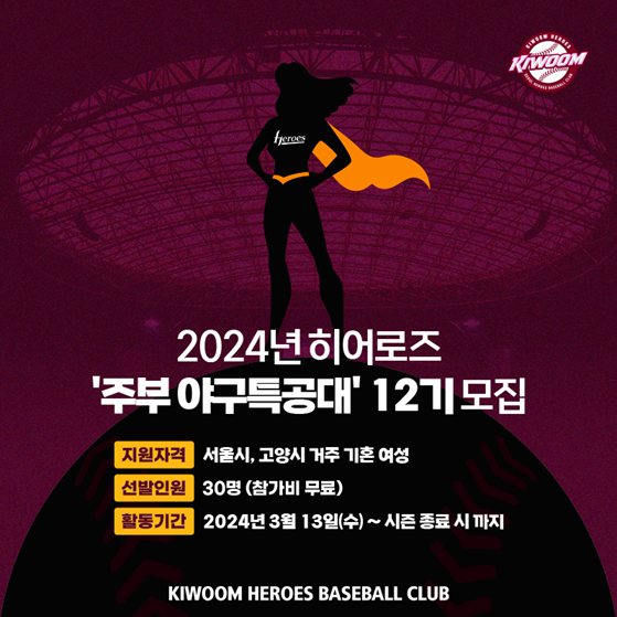 키움은 "2월 22일부터 3월 3일까지 '히어로즈 주부야구특공대' 12기를 모집한다"고 밝혔다.