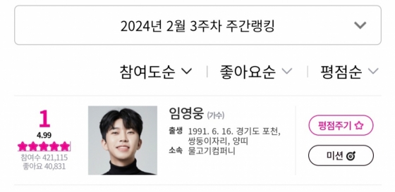 임영웅은 아이돌차트 2월 3주차 평점랭킹에서 42만 1115표를 획득, 1위를 차지했다.