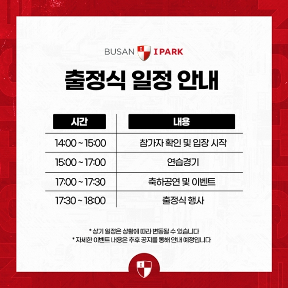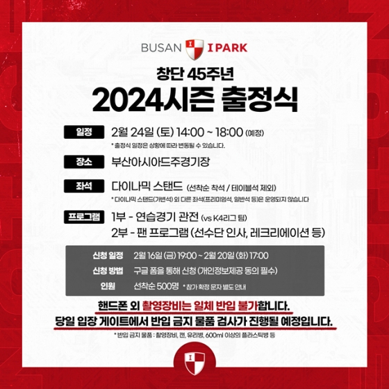 부산아시아드주경기장에서 1000명 규모로 치러지는 이번 출정식은 K4리그 팀과 연습경기로 시작된다. 리그 개막 전 선수들이 겨울에 갈고 닦은 실력을 미리 만나볼 수 있는 기회다. 경기가 끝난 후에는 선수단이 올 시즌 각오를 전하고, 팬들과 스킨십을 나눌 수 있는 시간을 가질 예정이다.