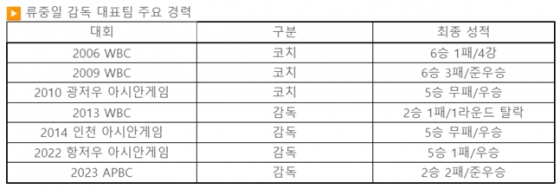 류중일(61) 감독이 한국 야구 대표팀 지휘봉을 다시 잡는다.