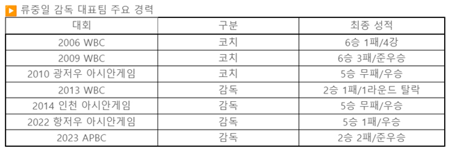 아울러 KBO는 "지난해 류중일 감독과 함께 대표팀의 성장과 세대교체에 공헌한 최일언 코치와 류지현 코치를 대표팀 투타 부문 전담 코치로 선임해 대표팀의 방향성과 정책 연구 및 전력 분석에 주력할 예정"이라고 전했다.