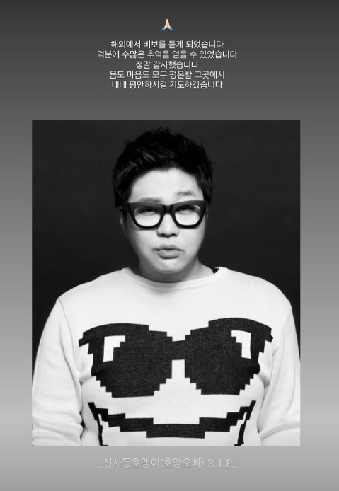 과거 신사동호랭이와 함께 일해왔던 티아라 출신 소연은 "해외에서 비보를 듣게 됐다. 덕분에 수많은 추억을 얻을 수 있었다. 정말 감사했다. 몸도 마음도 모두 평온한 그곳에서 내내 평안하시길 기도하겠다"라고 전했다.