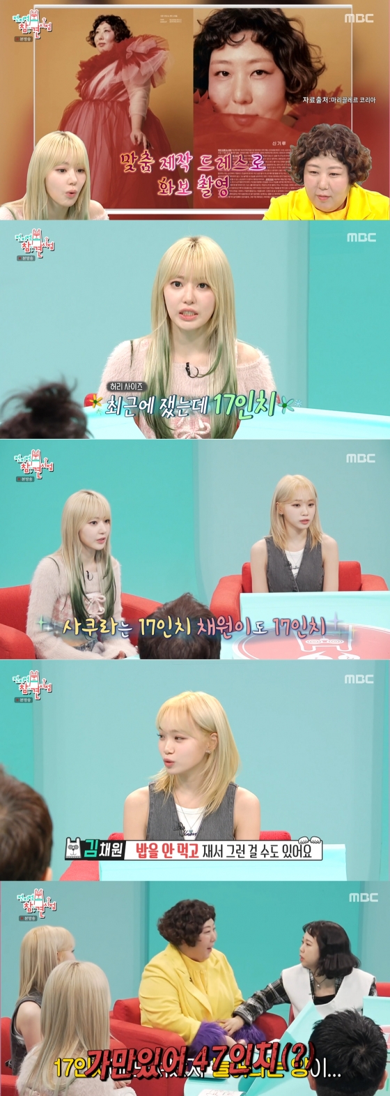 이에 사쿠라는 "최근에 사이즈를 쟀는데 17인치였다"라고 했다. 채원의 사이즈도 묻자 채원 역시 "17인치로 나왔다"라고 답했다. 그러면서 "밥을 안 먹고 재서 그런 걸 수도 있다"라며 겸손한 모습을 보였다.