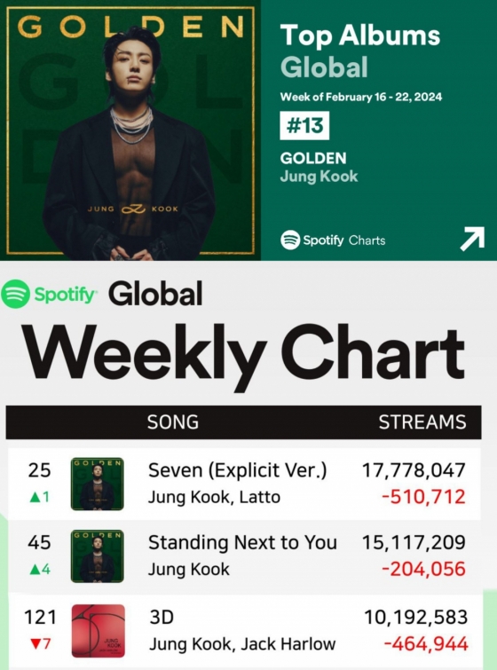 스포티파이 위클리(주간) 톱 송 글로벌 차트(2월 16일~22일)에서는 정국의 솔로 싱글 'Seven'(세븐)이 25위, '3D' 121위, 'GOLDEN' 앨범 타이틀곡 'Standing Next to You'(스탠딩 넥스트 투 유) 45위 등 총 3곡이 올랐고 각각 32주, 21주, 16주째 진입하며 강력한 글로벌 음원 파워를 보여줬다.