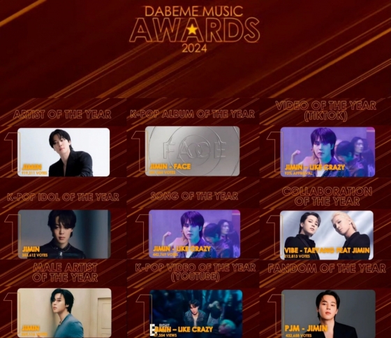 '다베메 팝' 발표에 따르면 지민은 후보에 오른 전 부문에서 압도적 표 차이로 모두 우승을 거머쥐며 9관왕에 올랐다. 단 한 명의 아티스트가 한 투표에서 수상 가능한 모든 부문을 독차지하는 것은 매우 이례적인 일이다. 지난해 솔로 활동을 시작한 이후 글로벌 팝 아이콘으로 주목 받아온 지민의 존재감을 보여준다.