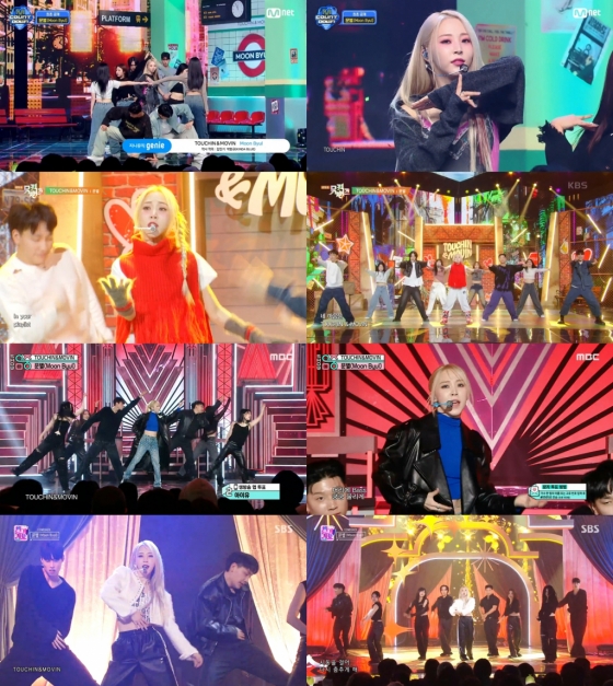 지난 20일 첫 솔로 정규앨범 'Starlit of Muse'(스탈릿 오브 뮤즈)를 발매한 문별은 22일 Mnet '엠카운트다운'을 시작으로 KBS 2TV '뮤직뱅크', MBC '쇼! 음악중심', SBS '인기가요'에 출연해 더블 타이틀곡 'TOUCHIN&MOVIN'(터친 앤 무빈)과 'Think About'(띵커바웃) 무대를 꾸몄다.