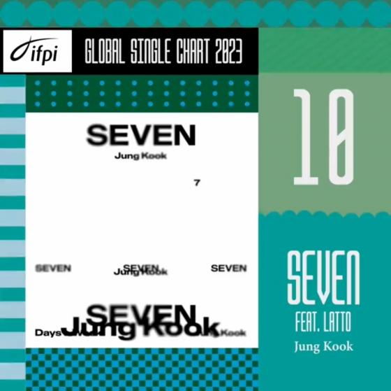 방탄소년단 정국은 IFPI가 26일(현지시간) 발표한 '2023 글로벌 싱글 차트(Global Single Chart)'에서 지난해 7월 발표한 첫 솔로 싱글 'Seven (feat. Latto)'으로 10위를 차지했다. 전 세계 8,000개 이상의 음반사를 회원으로 둔 IFPI는 매년 음반 산업 동향을 정리한 리스트를 발표한다. 그 가운데 '글로벌 싱글 차트'는 유료 구독 스트리밍, 싱글 트랙 다운로드 등 수치를 합산해 순위를 매긴다.
