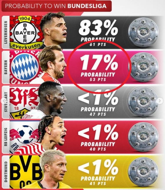 축구 전문 스코어90은 27일(한국시간) 공식 채널을 통해 이번 시즌 분데스리가 우승 예상 순위를 공개했다. 1위는 레버쿠젠으로 우승 확률이 무려 83%다. 2위는 뮌헨으로 17%에 불과했다. 3위는 슈투트가르트, 4위 라이프치히, 5위 도르트문트로 세 팀 모두 우승 확률이 1% 미만이었다.