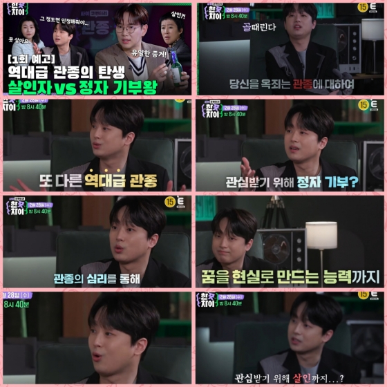 이날 '한 끗 차이' 주제는 '관종'. 앞서 공개된 예고 영상에서는 관심받기 위해 살인까지 저지른 최악의 '관종'과 관심받기 위해 어릴 때부터 키웠던 꿈을 현실로 만드는 능력으로 세계를 제패한 '관종'이 소개됐다.