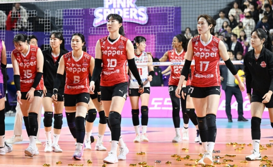 페퍼저축은행 선수들이 패배 후 어두운 표정을 짓고 있다. /사진=뉴스1