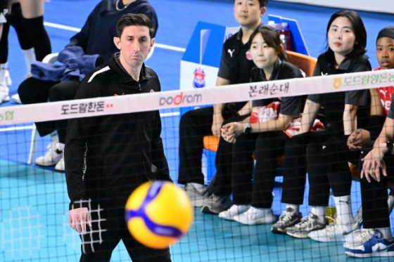 조 트린지 전 광주 페퍼저축은행 감독(가운데)가 선수들의 플레이를 지켜보고 있다. /사진=KOVO