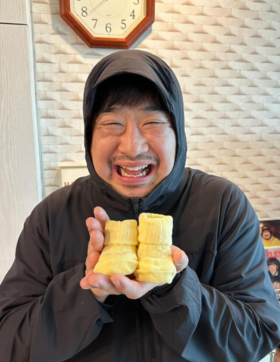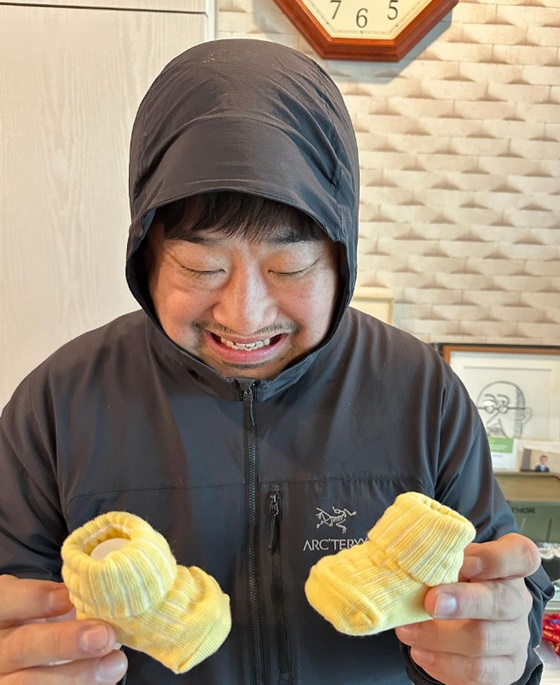 강재준은 29일 깡총이(태명)를 위한 자그마한 양말을 손에 들고 행복한 표정을 지었다.