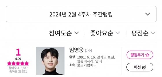임영웅은 아이돌차트 2월 4주차 평점랭킹에서 41만 3877표를 획득, 1위를 차지했다.