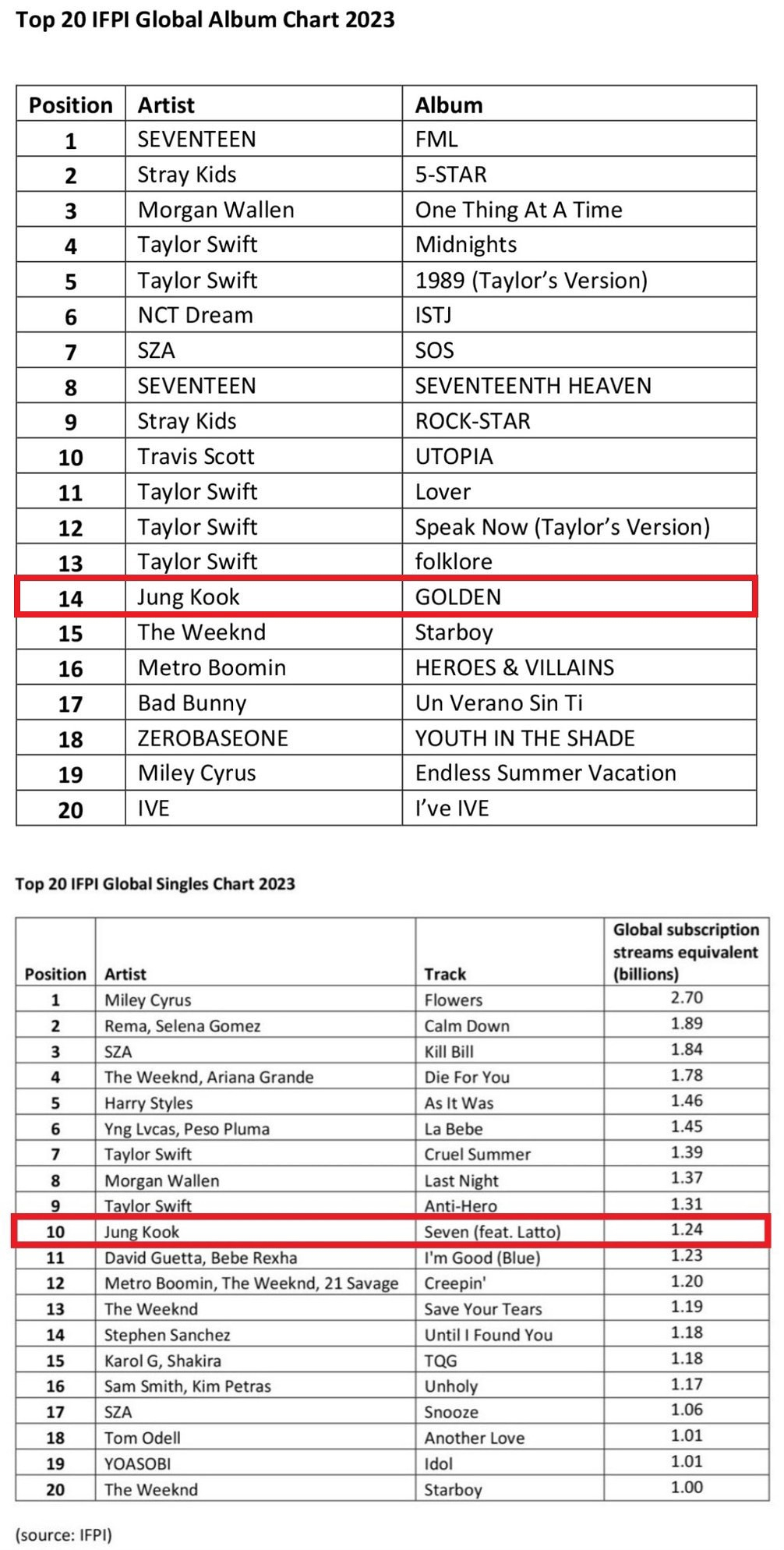 정국은 IFPI가 최근 발표한 '2023 글로벌 앨범 차트'(Global Album Chart)에서 지난해 11월 발매한 첫 솔로 앨범 'Golden'(골든)으로 14위를 차지했다. 정국은 한국 솔로 가수 중 유일하게 이름을 올렸고, 한 해 동안 전 세계에서 가장 많은 앨범을 판매한 아시아 솔로 가수로 기록됐다.