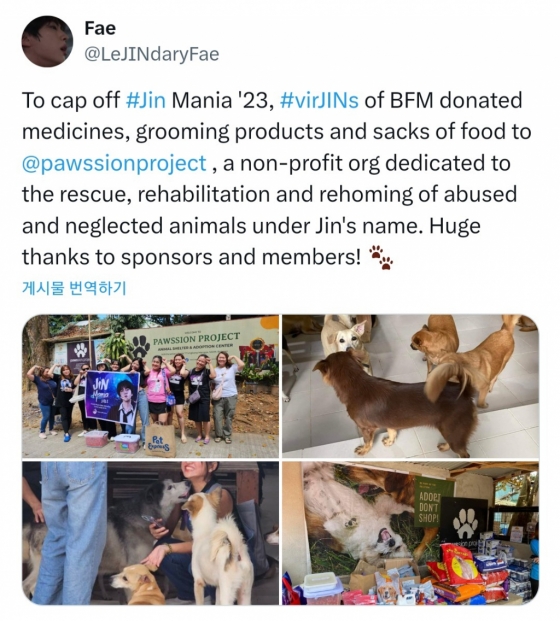 방탄소년단 진의 필리핀 팬들이 반려견들을 위한 따뜻한 나눔으로 선한 영향력을 전파했다.