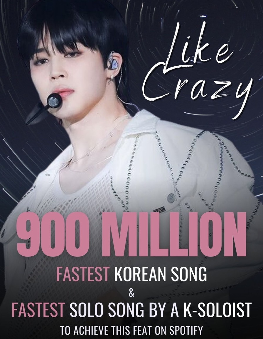방탄소년단(BTS) 지민의 '라이크 크레이지'(Like Crazy)가 스포티파이에서 9억 스트리밍을 돌파했다.