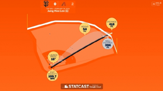 이날 하이라이트는 3회초였다. 이정후는 샌프란시스코가 0-2로 뒤처진 3회초 2사에서 시속 94.3마일(151.8㎞)로 몸쪽으로 들어오는 초구는 일단 쳐냈고 바깥쪽으로 낮게 떨어지는 두 개의 체인지업을 지켜봤다. 이후 4구째 시속 94.7마일(152.4㎞)의 빠른 공을 통타, 우중간 담장을 훌쩍 넘겼다. 라인드라이브로 총알 같은 속도로 날아갔다. MLB 공식 홈페이지 MLB닷컴에 따르면 타구속도는 무려 시속 109.7마일(176.5㎞), 발사각도는 18도, 비거리 418피트(127m)의 홈런이었다. 이날 양 팀에서 나온 타구 중 가장 빨랐다.