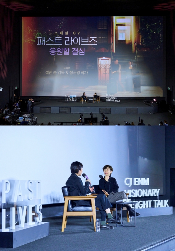 '헤어질 결심'의 정서경 작가와 '패스트 라이브즈' 셀린 송 감독이 지난 29일 CGV 용산아이파크몰에서 진행된 CJ ENM VISIONARY INSIGHT TALK, ''패스트 라이브즈' 응원할 결심' GV를 성료, 국내 영화계의 이목을 집중시키고 있다. 오는 3월 6일 국내 개봉을 앞둔 '패스트 라이브즈'는 서울에서 어린 시절을 보낸 첫사랑 '나영'과 '해성'이 24년 만에 뉴욕에서 다시 만나 끊어질 듯 이어져온 그들의 인연을 돌아보는 이틀간의 운명적인 이야기를 그린 작품.