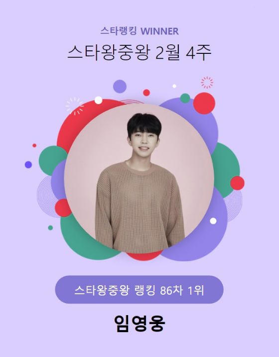 임영웅은 2월 23일 오후 3시 1분부터 3월 1일 오후 3시까지 진행된 2월 4주(86차) 스타왕중왕 랭킹 투표에서 1위에 등극했다.