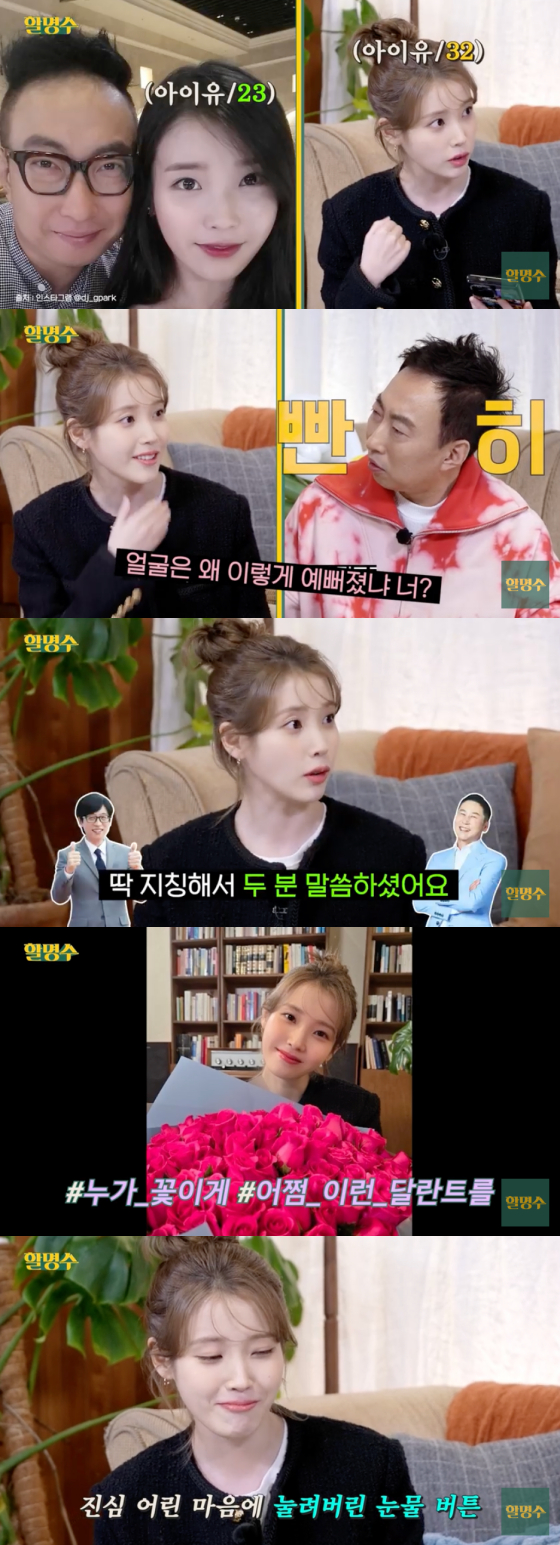 박명수는 또 아이유를 위해 직접 새벽 시장에서 구매한 장미꽃 백 송이와 할머니를 위한 한과를 선물해 감동을 안겼다. 할머니 선물까지 챙겨준 정성에 감동한 아이유는 "눈물날 것 같다"며 눈물을 글썽였다.