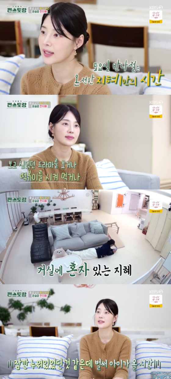 이날 한지혜는 안경을 쓰고 거실 바닥에 홀로 누워 혼자만의 시간을 즐겼다. 그는 "신랑이 한두 번씩 아기를 데리고 시댁에 가서 점심도 먹고 저녁도 먹고 온다"며 "그럼 토요일 하루는 아이가 없는 조용한 집에서 온전한 시간이 주어진다"고 설명했다.