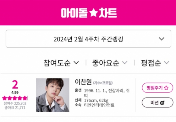 이찬원은 2월 4주 차 아이돌차트 평점랭킹에서 22만 5703표를 획득, 전체 2위를 차지했다.